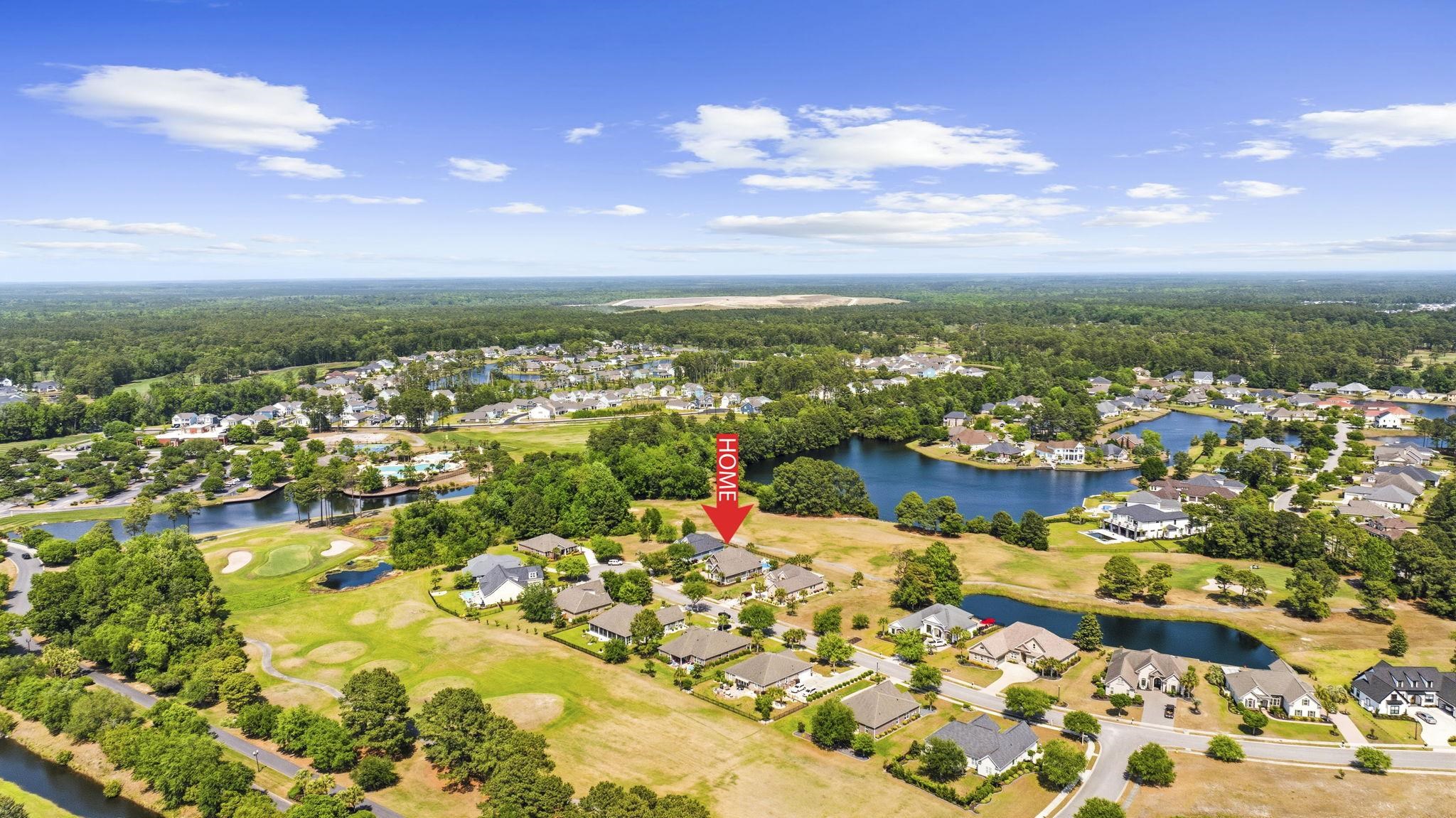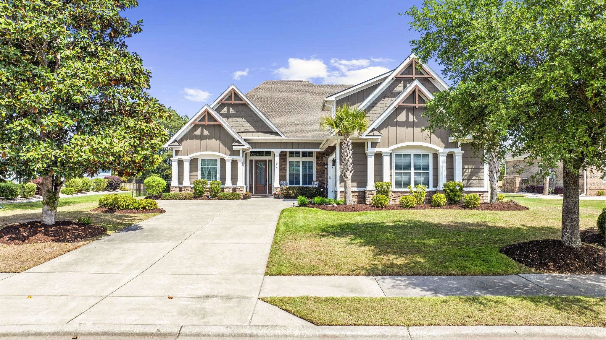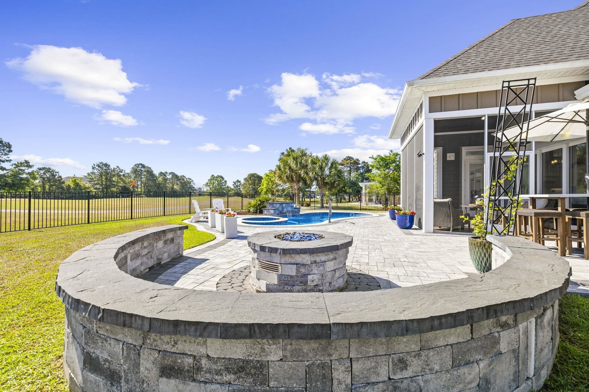 Welcome to a beautifully crafted custom home tucked away on a quiet cul de sac in Wild Wing Plantation, offering comfort, thoughtful design, and serene golf course views overlooking Hole 1 of the Hummingbird course, complemented by peaceful waterviews just beyond. Step outside to a private outdoor retreat designed for year round enjoyment. The fully fenced backyard features a 14' x 30' resort style fiberglass pool with both a heater and chiller, a soothing waterfall feature, a relaxing spa, and a custom natural gas fire pit perfect for evenings under the Carolina sky. Lush landscaping enhances the setting, while an underground irrigation system keeps the grounds looking their best. With golf and water views as your backdrop, the outdoor space feels both private and picturesque. The screened porch is a standout, highlighted by a dramatic vaulted wood ceiling that adds warmth and creates an inviting place to enjoy the coastal breeze. Inside, the home showcases exceptional craftsmanship throughout. High end porcelain tile flooring spans the entire residence with no carpet anywhere, creating a clean, elevated feel. Extensive board and batten detailing adds architectural character, while the main living area is anchored by a striking stone fireplace wall with custom built ins, complemented by beam accents and tray ceilings for added depth and dimension. The open concept layout flows effortlessly and is enhanced by pocket doors and quality finishes in every space. The functional split floor plan offers four spacious bedrooms and three full baths, providing privacy for guests or a home office. The primary suite serves as a private retreat with tray ceilings and two walk in closets, offering true his and hers storage. Practicality meets luxury in the impressive 720 square foot extended garage, offering ample room for a workshop, storage, or hobbies. Built with 2x6 exterior wall construction, the home reflects quality and efficiency, and a generous walk in attic provides even more storage. Residents of Wild Wing Plantation enjoy access to two well regarded golf courses, Avocet and Hummingbird, along with a clubhouse, fitness center, and a beautifully designed community pool. This property offers a rare combination of custom finishes, privacy, and refined golf and waterview living.