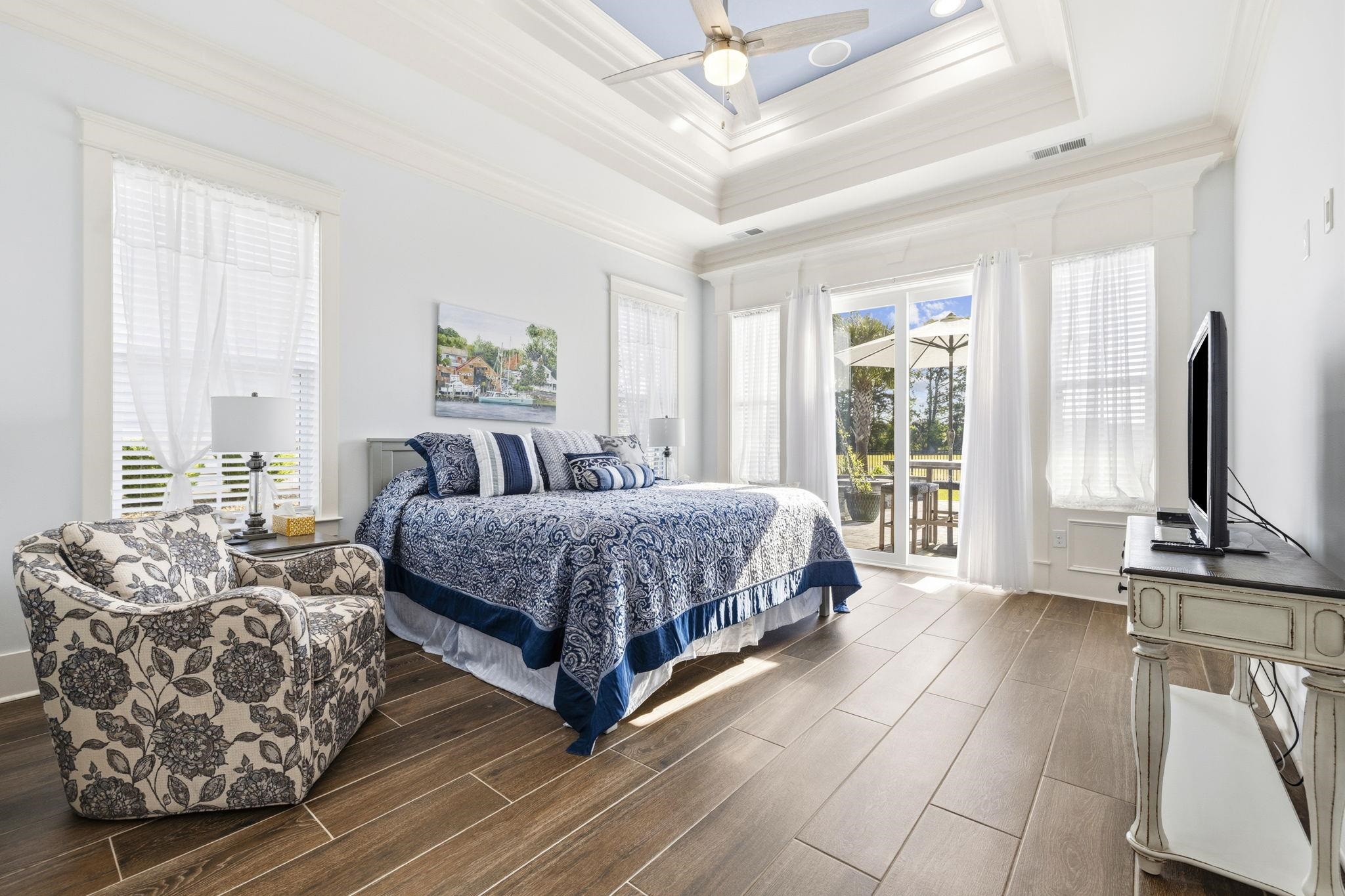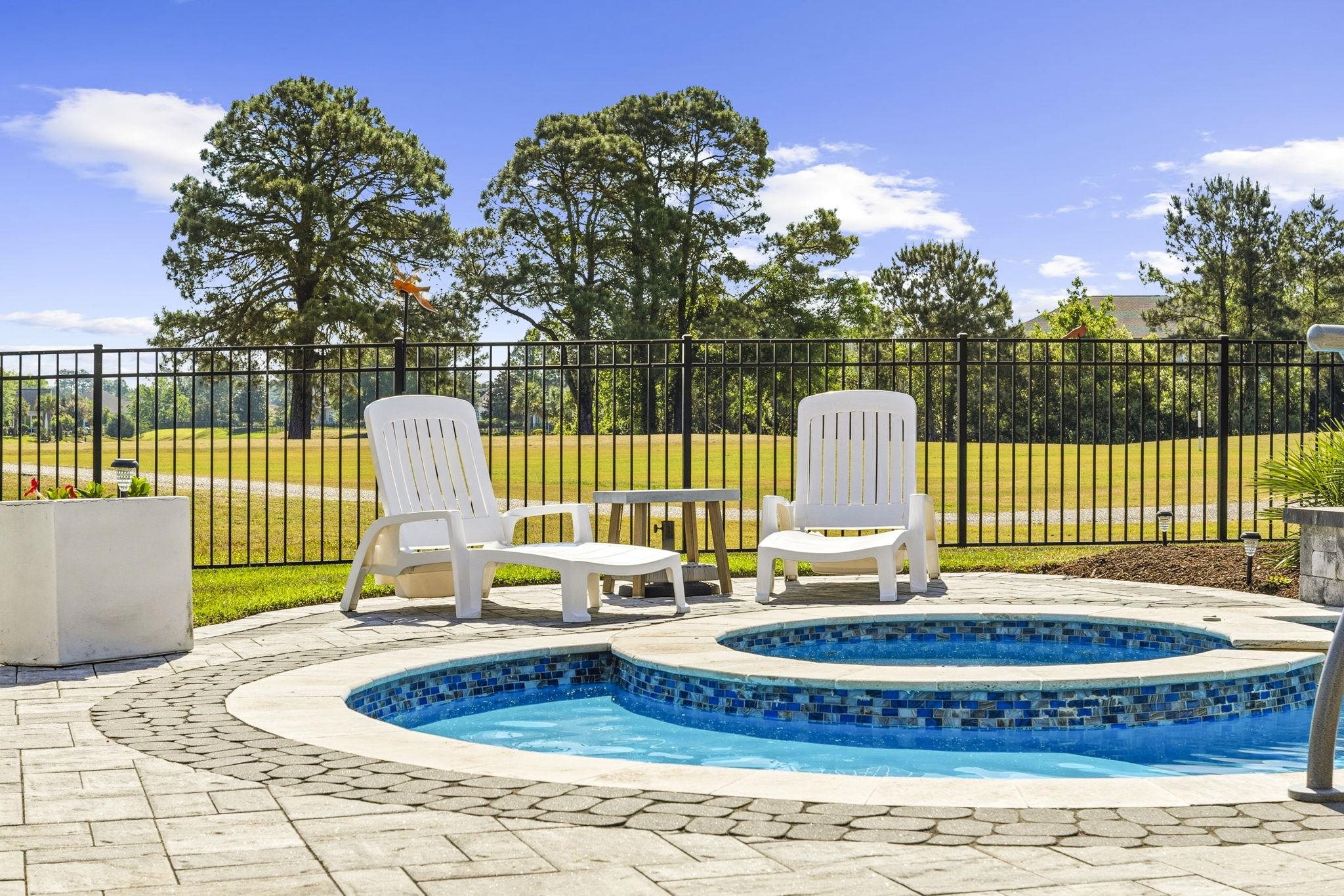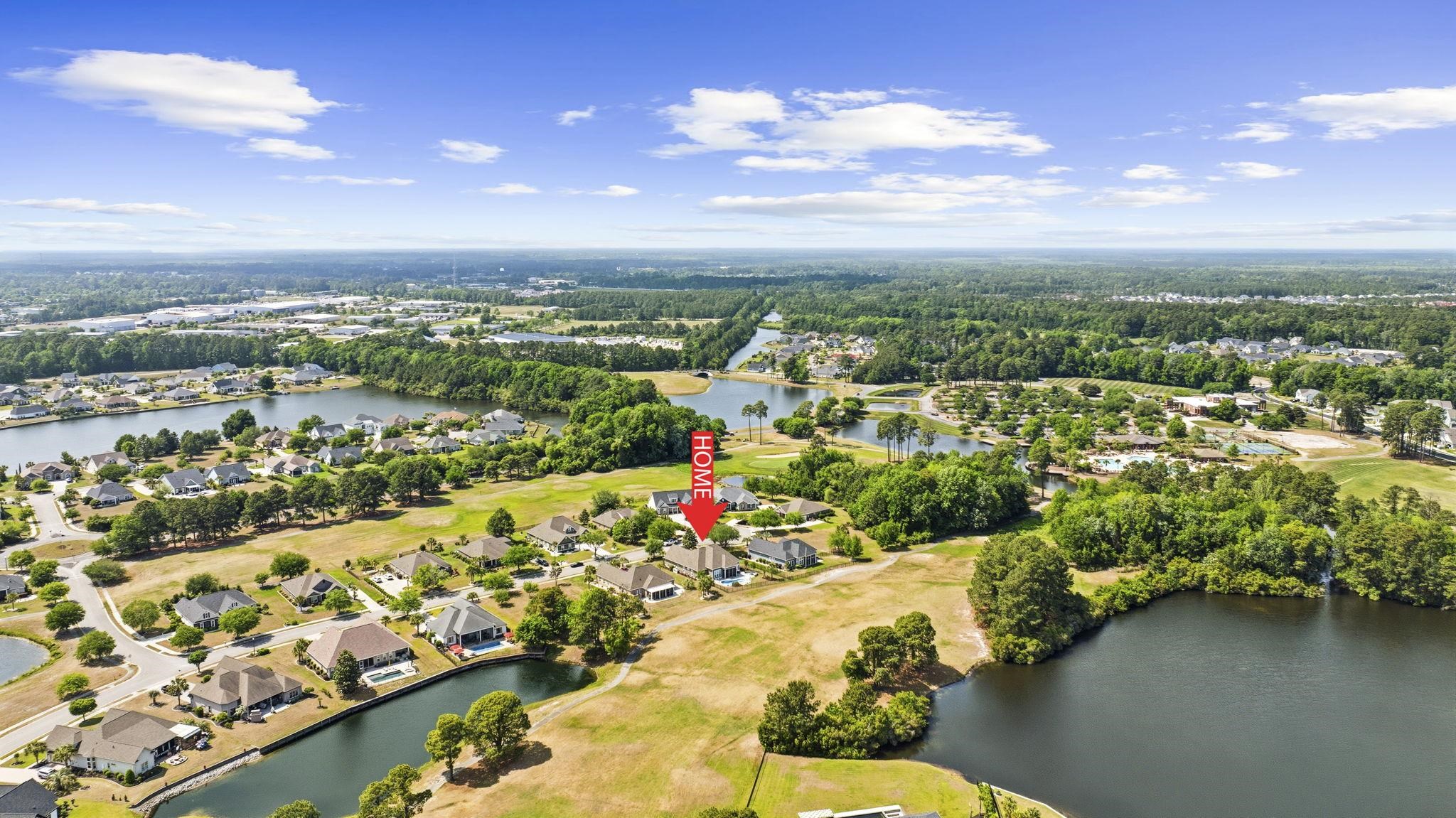 Welcome to a beautifully crafted custom home tucked away on a quiet cul de sac in Wild Wing Plantation, offering comfort, thoughtful design, and serene golf course views overlooking Hole 1 of the Hummingbird course, complemented by peaceful waterviews just beyond. Step outside to a private outdoor retreat designed for year round enjoyment. The fully fenced backyard features a 14' x 30' resort style fiberglass pool with both a heater and chiller, a soothing waterfall feature, a relaxing spa, and a custom natural gas fire pit perfect for evenings under the Carolina sky. Lush landscaping enhances the setting, while an underground irrigation system keeps the grounds looking their best. With golf and water views as your backdrop, the outdoor space feels both private and picturesque. The screened porch is a standout, highlighted by a dramatic vaulted wood ceiling that adds warmth and creates an inviting place to enjoy the coastal breeze. Inside, the home showcases exceptional craftsmanship throughout. High end porcelain tile flooring spans the entire residence with no carpet anywhere, creating a clean, elevated feel. Extensive board and batten detailing adds architectural character, while the main living area is anchored by a striking stone fireplace wall with custom built ins, complemented by beam accents and tray ceilings for added depth and dimension. The open concept layout flows effortlessly and is enhanced by pocket doors and quality finishes in every space. The functional split floor plan offers four spacious bedrooms and three full baths, providing privacy for guests or a home office. The primary suite serves as a private retreat with tray ceilings and two walk in closets, offering true his and hers storage. Practicality meets luxury in the impressive 720 square foot extended garage, offering ample room for a workshop, storage, or hobbies. Built with 2x6 exterior wall construction, the home reflects quality and efficiency, and a generous walk in attic provides even more storage. Residents of Wild Wing Plantation enjoy access to two well regarded golf courses, Avocet and Hummingbird, along with a clubhouse, fitness center, and a beautifully designed community pool. This property offers a rare combination of custom finishes, privacy, and refined golf and waterview living.