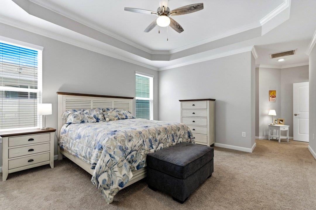 PrimaryBedroom: TrayCeilings, CeilingFans, LinenCloset, MainLevelPrimary, WalkInClosets
