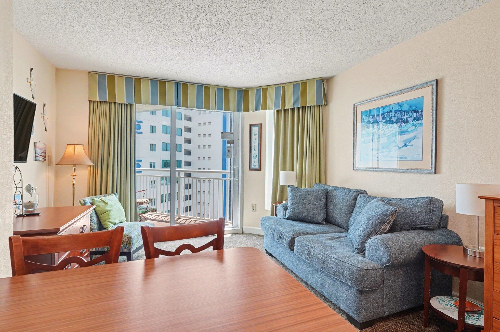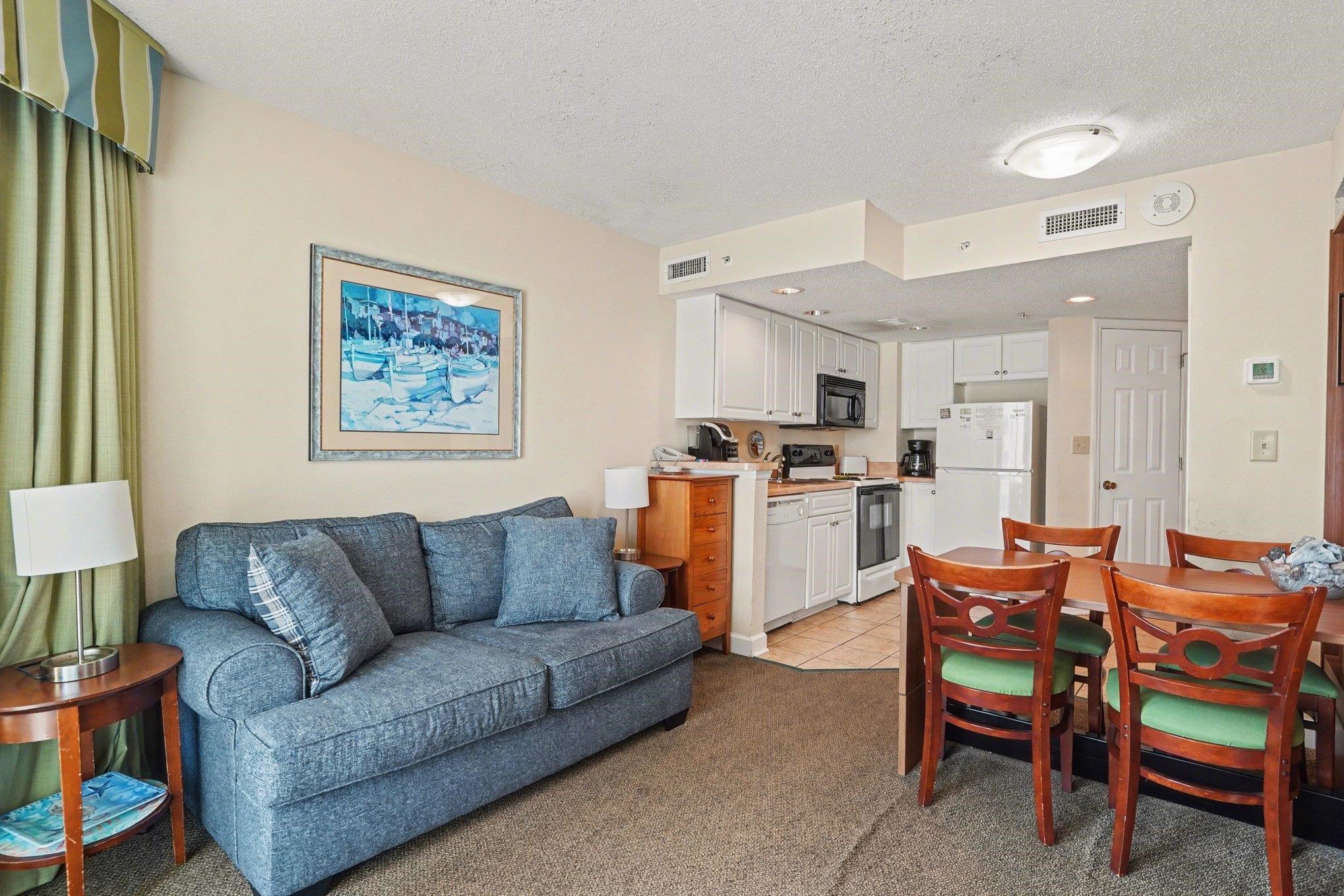 This furnished 1-bedroom, 1-bath oceanview condo offers a versatile layout with two queen beds, a sofa, and a Murphy bed, comfortably accommodating guests. Tile flooring enhances the kitchen and bathroom, while plush carpeting adds warmth to the main living area and bedroom. The open living and dining space is filled with natural light and leads to a private balcony through floor-to-ceiling glass sliders. The kitchen provides ample cabinet and counter space and comes fully equipped with all appliances. The bathroom features a vanity and a tub/shower combination, and the convenience of an in-unit washer and dryer adds to the appeal. This property is ideal as a primary residence, vacation getaway, or investment opportunity. Located near Springmaid Pier, Myrtle Beach State Park, The Market Common, and Myrtle Beach International Airport, Holiday Sands offers exceptional convenience and resort-style amenities. Enjoy indoor and outdoor pools, a lazy river, hot tubs, an oceanfront sun deck, on-site dining, a fitness center, and easy beach access-all just a short distance from the area's top attractions.