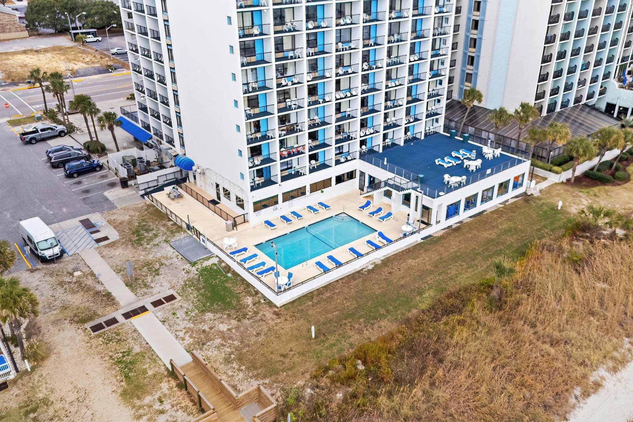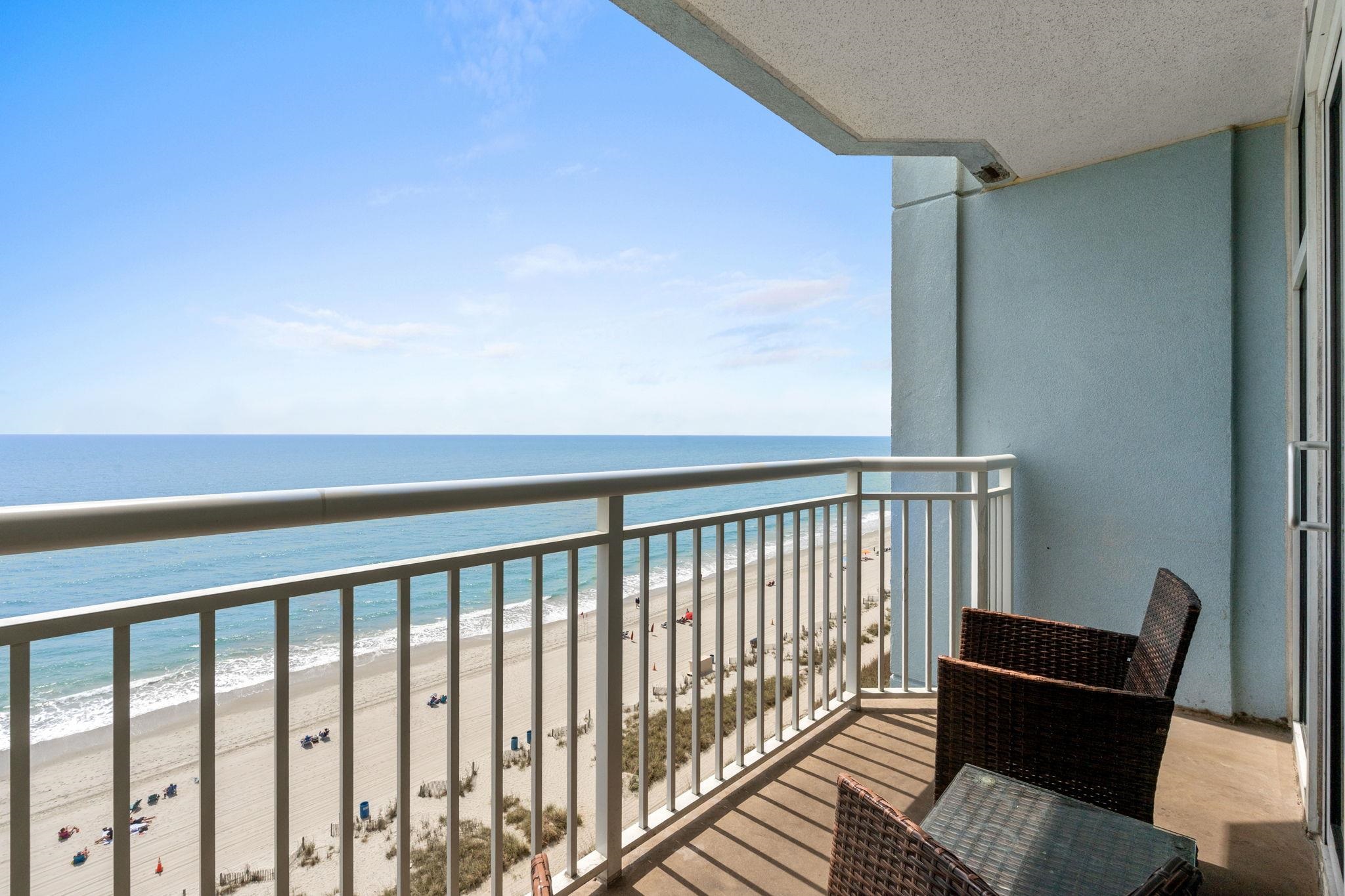 2501 S. Ocean Blvd #909 at Holiday Sands South offers a direct oceanfront 1-bedroom, 1-bath condo on the 9th floor with incredible panoramic views of the Atlantic Ocean in Myrtle Beach. Designed for both personal use and rental potential, this unit sleeps 6-8 guests and features a practical layout with no carpet, combining tile flooring in the entry, hallway, kitchen, and bathroom with laminate flooring in the living room and bedroom. The HVAC system was replaced in 2021, and the building includes four elevators for convenient access. Entry into the condo opens to a foyer/hallway with a digital safe and a laundry closet that includes a stacked washer and dryer installed in 2024. The kitchen is equipped with stainless steel appliances, including a Frigidaire refrigerator installed in 2025, Bosch dishwasher, and Kenmore range, along with a double-basin sink with a garbage disposal. The space flows directly into the living and dining area, where a Murphy bed is integrated into the dining setup, allowing the table to fold down automatically when the bed is in use. A full-size futon couch, new in 2026, adds additional sleeping capacity and flexibility for guests. The bedroom is generously sized with two queen beds, along with a closet and an owners closet for storage. The hall bathroom includes a tub/shower combination, updated lighting, and a wall-mounted hair dryer. Sliding doors from the living area lead to the private oceanfront balcony, furnished with two outdoor wicker-style chairs and a glass-top table, providing a direct vantage point for morning sunrises and time overlooking the beach. Resort amenities include 2 outdoor pools, 2 indoor pools, a lazy river, 2 splash decks, sunning area, a fitness center, business center, and J Mikes Flavor Station. The HOA fee covers electric within the unit, building insurance, water and sewer, basic cable, internet, property management, elevator and pool maintenance, common area maintenance and repair, pest control, trash service, and even telephone service within the condo. Ownership here means stepping into a ready-to-use oceanfront property where time is spent on the beach, on the balcony watching the shoreline, at the pool between beach trips, or generating rental income. Schedule your showing today and secure your place on Myrtle Beachs oceanfront.