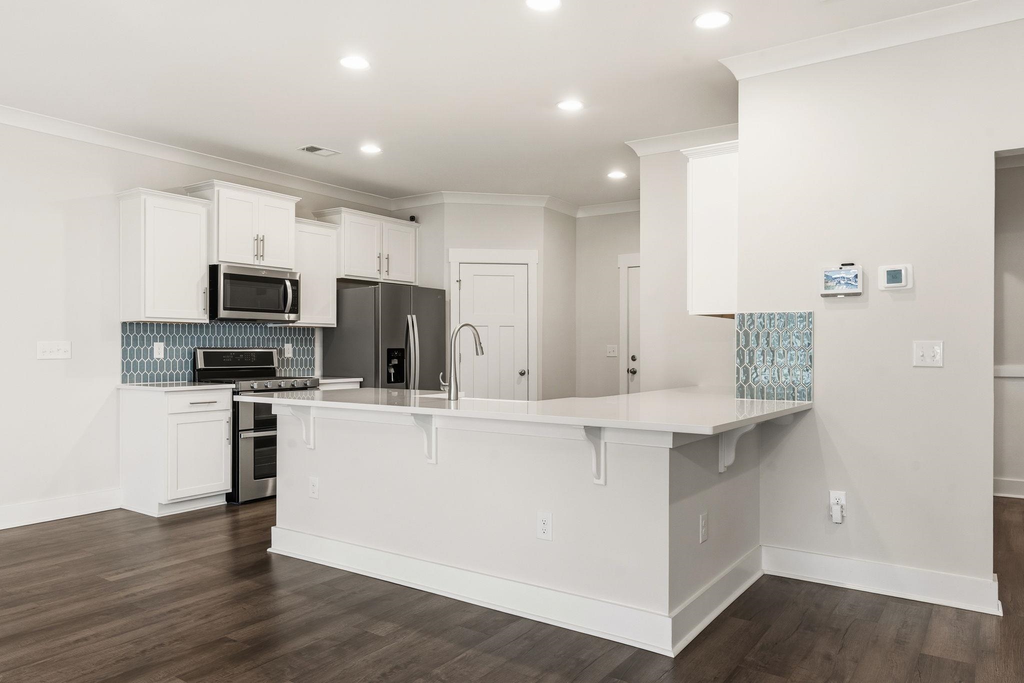 Three-bedroom, two-bathroom move-in ready home in Beach Gardens by Great Southern Homes in Conway, South Carolina 29526. This GreenSmart natural gas community offers energy-efficient construction including a tankless gas water heater, gas HVAC, and high-performance Low-E tilt-out windows. The single-story floor plan features 9-foot ceilings, crown molding, LVP flooring throughout the main living areas, and plush carpet in all bedrooms. The open-concept living area includes a stone-surround gas fireplace with wood mantel and ceiling fan, flowing directly into the dining area and kitchen. The kitchen is equipped with white shaker cabinetry with crown molding, quartz countertops, a large peninsula island with breakfast bar seating, stainless steel appliances including a smooth-top gas range, built-in microwave, and dishwasher, plus a teal hexagonal tile backsplash. The primary suite includes plush carpet, crown molding, a ceiling fan, walk-in closet, and an en suite bath with a double vanity, quartz countertops, walk-in tiled shower, and a soaking tub with subway tile surround. Two additional guest bedrooms - both carpeted - share a full hall bath with a tub/shower combo and quartz vanity top. A dedicated laundry room sits just inside the attached two-car garage entry for everyday convenience. The screened rear porch with ceiling fan overlooks a spacious backyard with open green space views and automatic irrigation. Beach Gardens by Great Southern Homes is a well-established community located near Historic Downtown Conway with easy access to the Conway Riverwalk, local dining, and boutique shops. The Grand Strand's coastal beaches are approximately 15 minutes away. Conway, SC 29526.